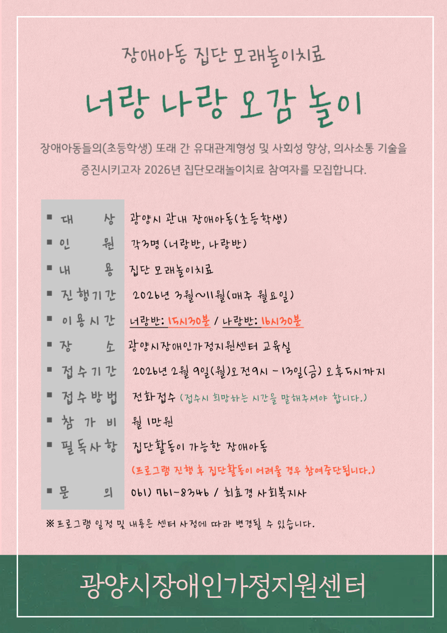 2026년 장애아동집단 모래놀이치료 참여자 모집