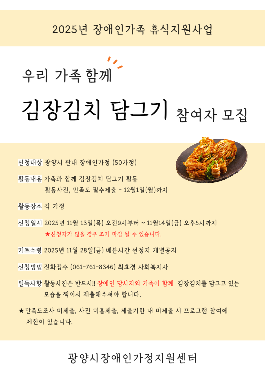 2025년 장애인가족휴식지원사업 5차 (김장김치담그기) 참여자 모집