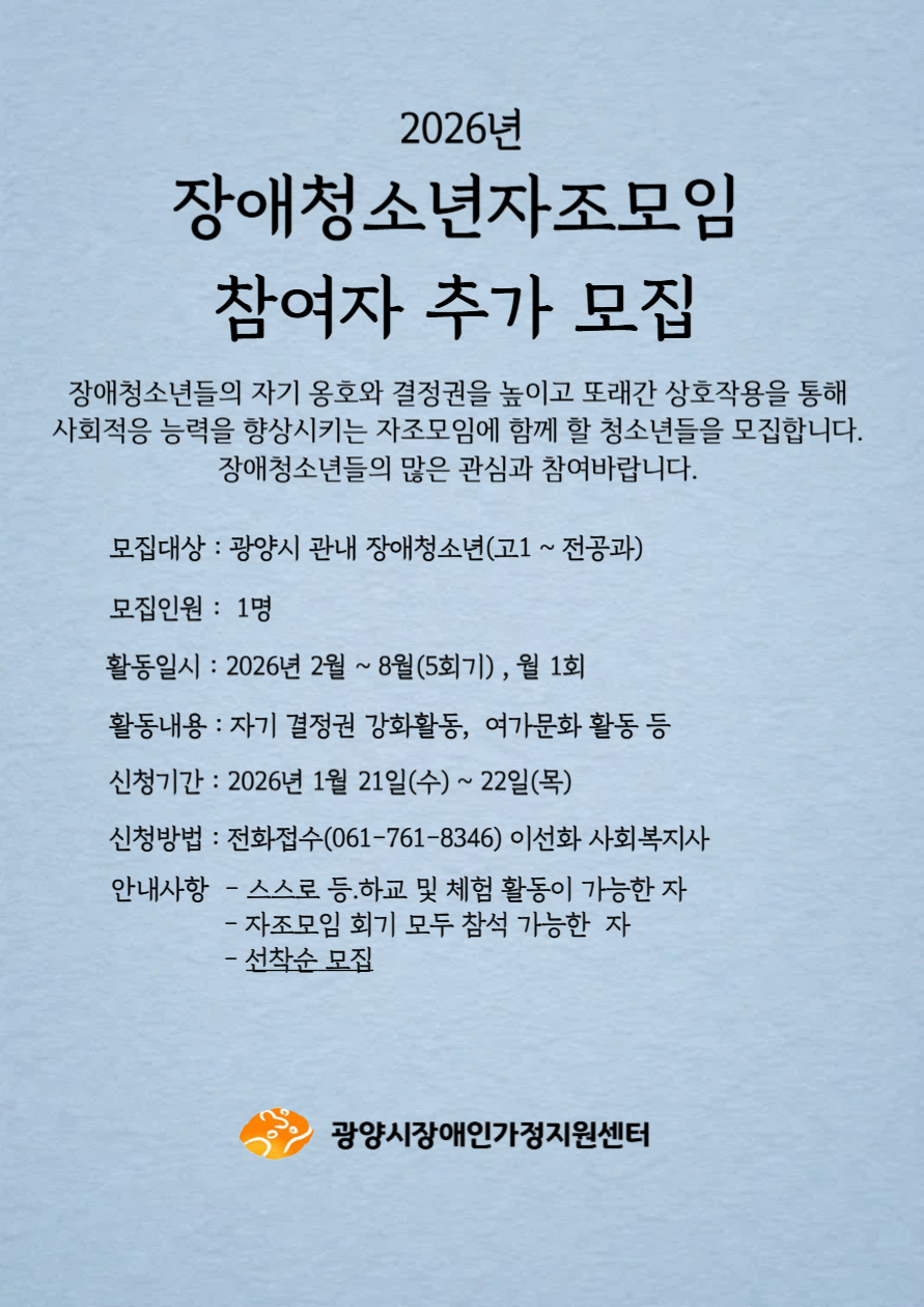 2026년 장애청소년자조모임 참여자 추가모집(1명) - 추가모집 마감 완료